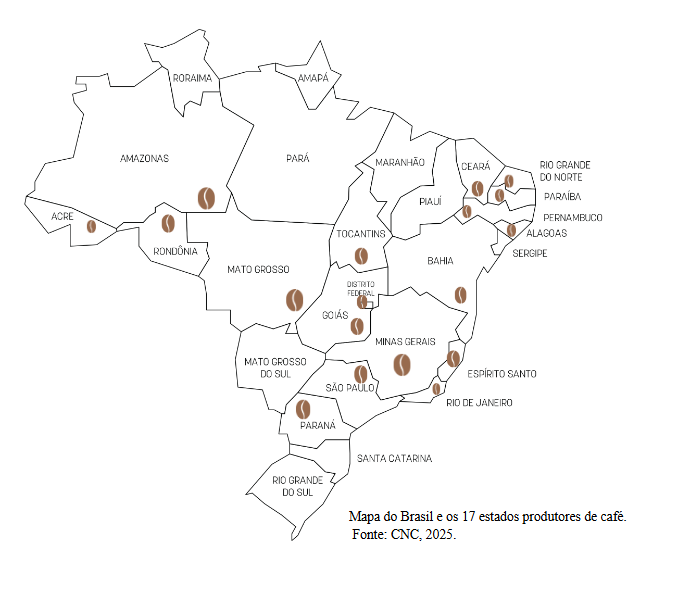 Atualmente, Minas Gerais (51,2%), Espírito Santo (24,7%), São Paulo (9,6%), Bahia (7,5%) e Rondônia (3,6%) concentram cerca de 97% da produção nacional de café, com uma receita bruta estimada em R$ 115,27 bilhões4, mostrando a força histórica e econômica dessa cultura.